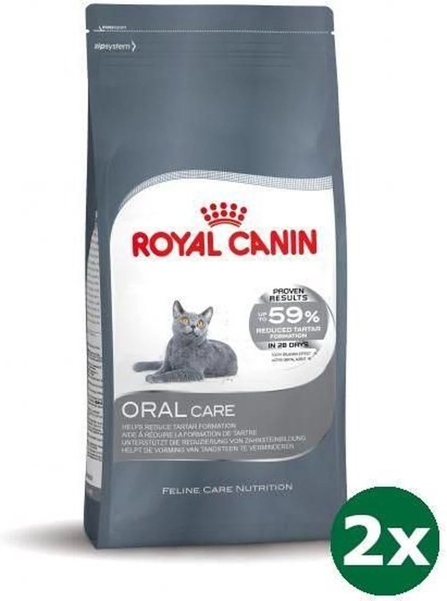 Royal Canin Oral Sensitive 1,5KG2 op de 3 katten hebben mond- en gebitsaandoeningen.- Tandplak is een bacteriΓ«le afzetting op het tandoppervlak. De tandplak bacteriΓ«n zetten het calcium om in tandsteen. Op den duur kunnen bacteriΓ«n leiden tot ontstoken tandvlees, slechte adem en zelfs het uitvallen van gebitselementen.- Mechanisch reinigingseffect bevorderen; wanneer de kat op brokken kauwt ontstaat een schurend effect, waardoor de vorming van tandplak beperkt wordt. β Chemisch reinigingseffect bevorderen; remt de vorming van tandsteen dankzij de toevoeging van calciumvangers.Dubbele werking voor een optimale mond- en gebitshygiΓ«ne.- De unieke vorm en textuur van de brok helpen de afzetting van tandplak te verminderen dankzij het mechanische reinigingseffect.- De natriumpolyfosfaten binden calcium in de mondholte en helpen daarmee de vorming van tandsteen te verminderen.